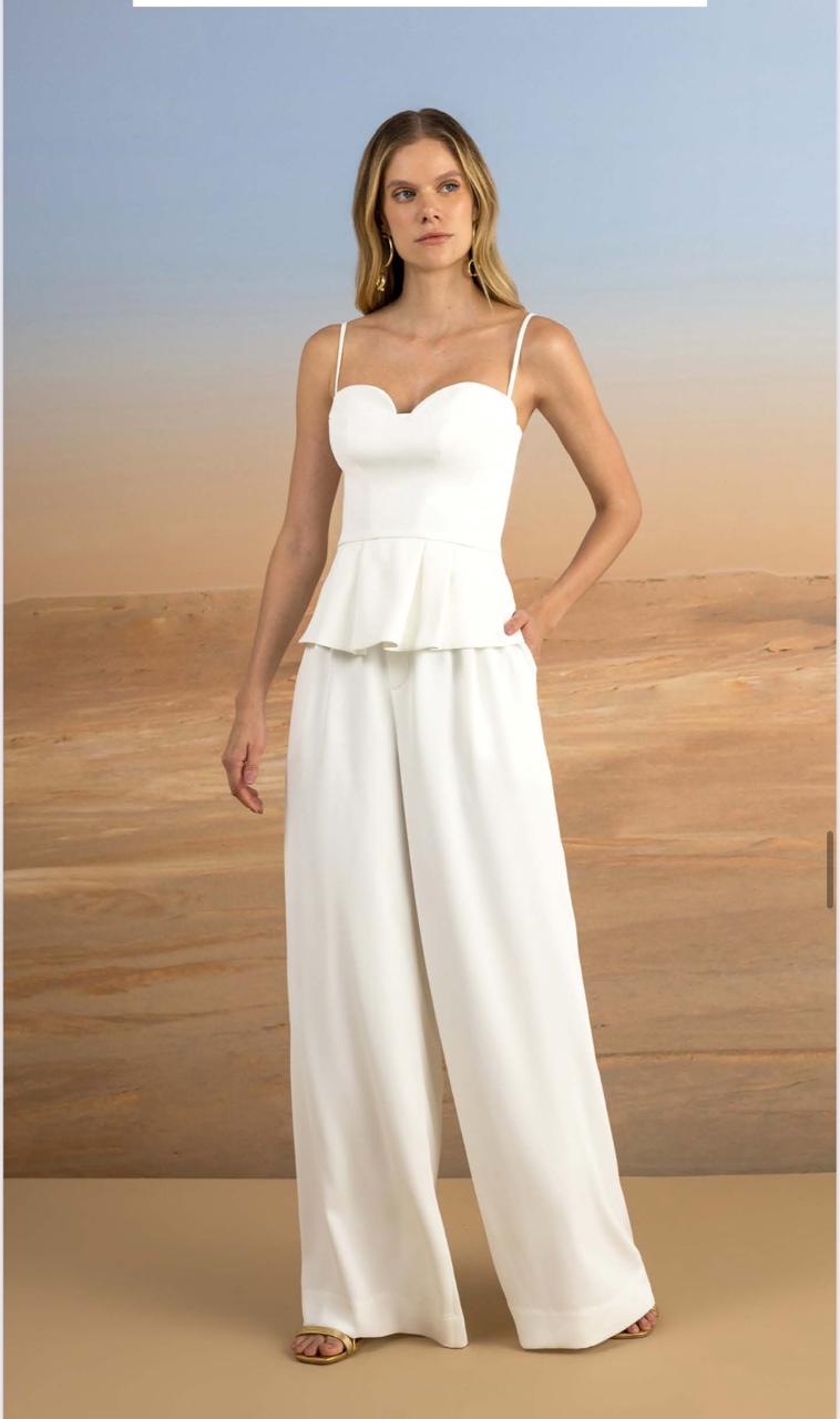 Este conjunto Skazi une o charme do corselet estruturado com detalhe peplum à fluidez da calça de alfaiataria em modelagem ampla. A proposta monocromática em off white reforça o ar sofisticado, ideal para quem busca um visual clean, mas impactante.
